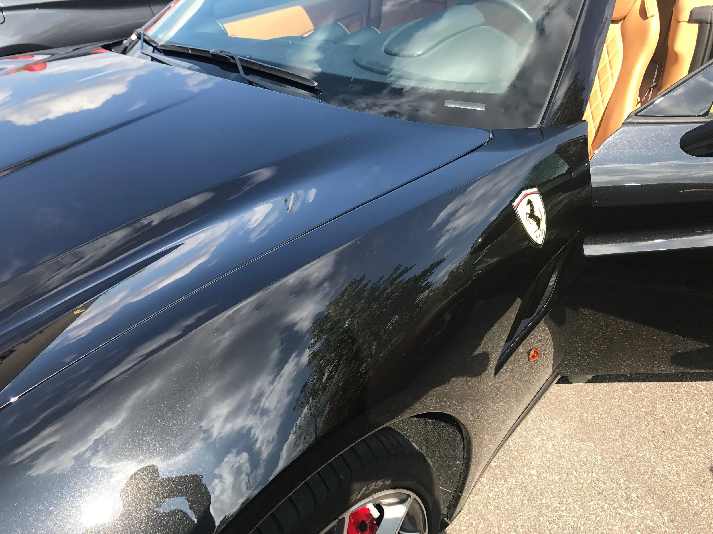 This Ferrari first came to us in the summer of 2017 with several thousand miles on it. Thankfully they were babied miles and we had a car in excellent shape that just needed a little love and a lot of protection. The owner likes to drive his cars a lot and we wanted to make sure that it would look its best and stay that way for a long time to come. We brought the vehicle in and did a decontamination detail wash on it. We also removed the failing factory installed PPF strips on the rocker panels intake areas. Then we began the polishing the Nero Daytona Metallic paint. It was in very good condition and didn’t require extensive time to perfect. The next step was to install PPF film on the front end and Rocker Panels. During this install in 2017, we installed a partial front end which covers the leading 22” of the hood and wraps around to the corresponding fenders. We also protected the headlights, bumper and side view mirrors with the film. Ceramic Pro 9H ceramic glass coating was applied to all remaining pained areas included the cowl under the convertible hard top. The Ceramic Pro Light (now called Top Coat) was installed over the entire car including the PPF for additional protection, slickness and gloss! The wheels were removed and thoroughly cleaned then the wheels and calipers were coated with Ceramic Pro Wheel and Caliper for years of protection, high gloss and ease of cleaning.